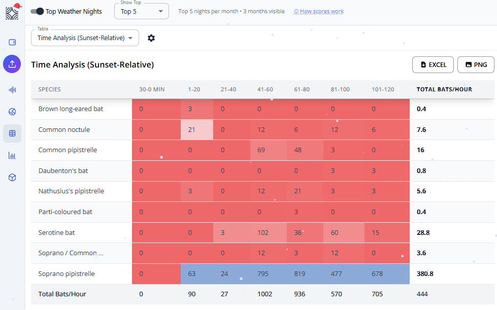 In the analysis below the AI found 11 000 soprano pipistrelle (74%) , which happens often. Also Noise files are often >70% of all files.